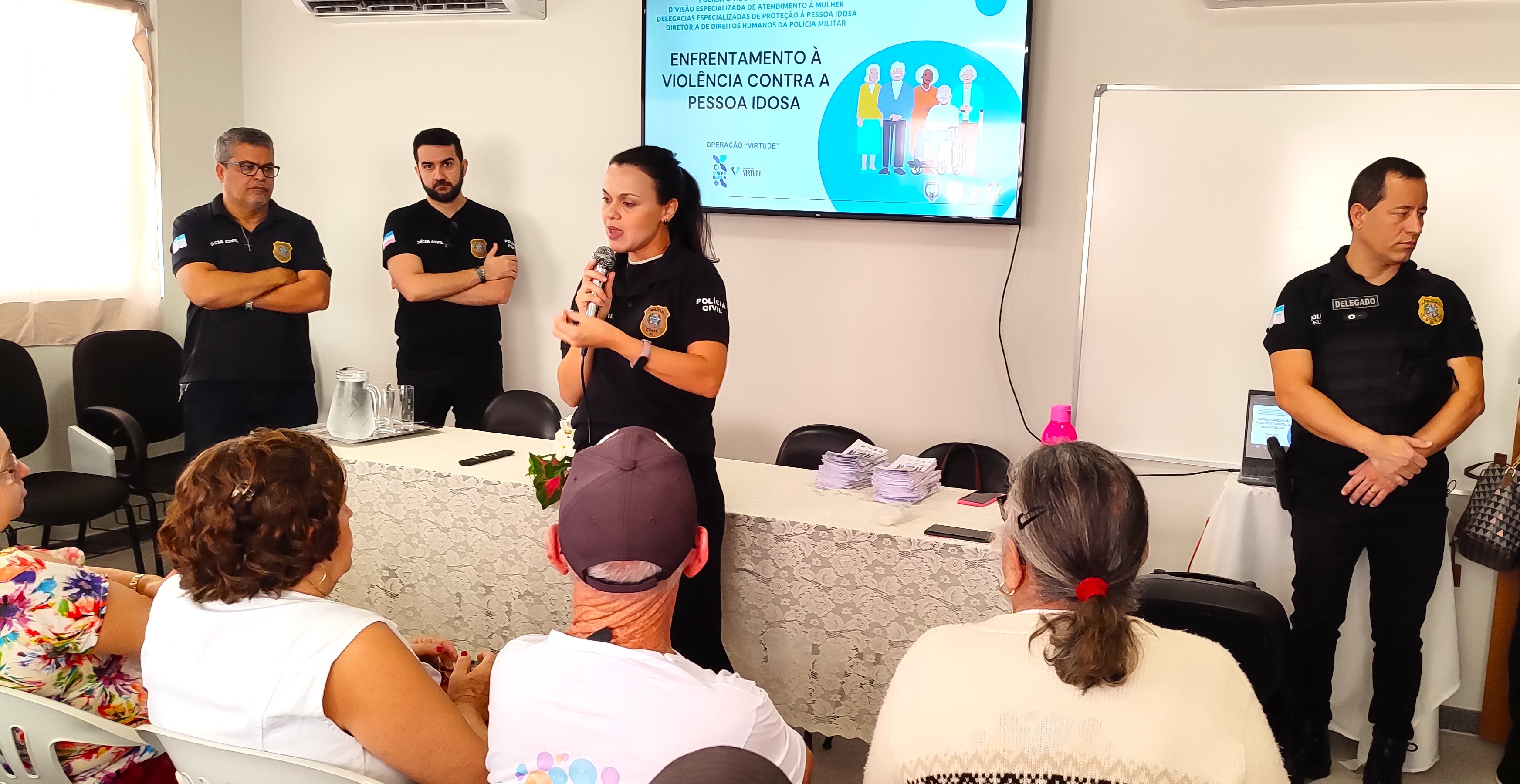 A primeira palestra foi ministrada pela delegada Dra. Jaciely Favoretti Souza, trazendo esclarecimentos sobre os golpes sofridos por pessoas acima de 60 anos, além de como agir, tanto o idoso, como familiares e/ou vizinhos que percebam que um idoso possa estar sendo violentado de alguma maneira, seja ela de forma física, moral, financeira, psíquica e/ou sexual e, que faça imediatamente contato com as autoridades ou denuncie.