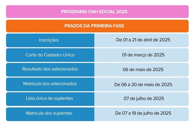 As inscrições para a primeira fase do programa CNH Social 2025 já estão abertas e devem ser feitas de forma online, até o dia 21 de abril de 2025, no site www.detran.es.gov.br (clicar no banner ou no botão do programa ‘CNH Social’, na página principal, e inserir as informações pessoais solicitadas). Estão sendo disponibilizadas 3.500 vagas.