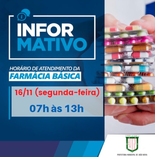 A Prefeitura Municipal de João Neiva por meio da Secretaria Municipal de Saúde (Semsa), informa que na próxima segunda-feira (16), a Farmácia Básica funcionará de 7h às 13h.