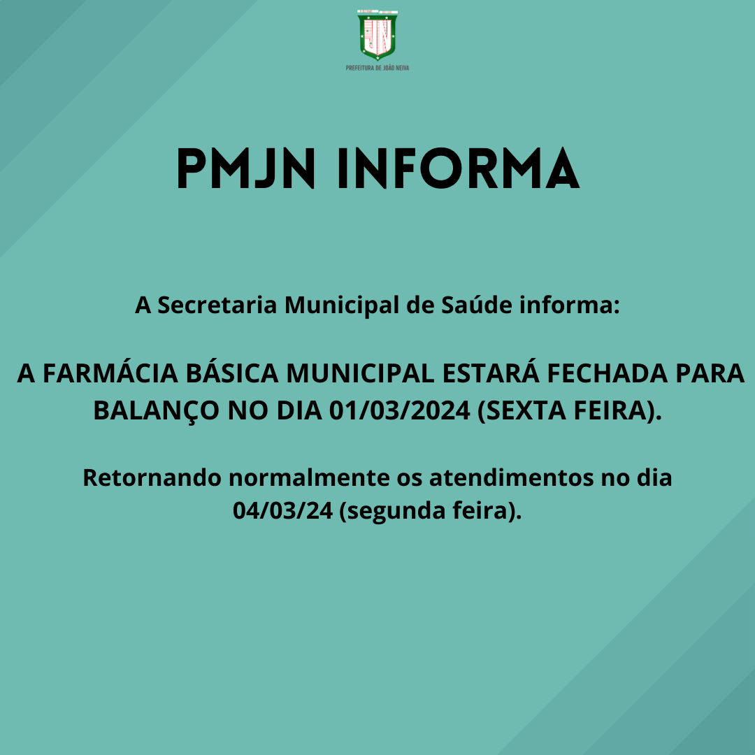 A farmácia básica municipal estará fechada para balanço no que no dia 01/03/2024 (sexta feira).