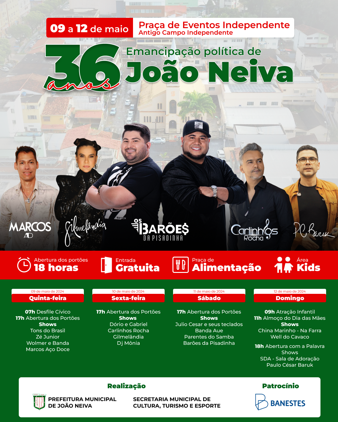 A Prefeitura Municipal de João Neiva, por meio da Secretaria Municipal De Cultura Turismo e Esporte, divulgou oficialmente na manhã dessa sexta-feira (19), a programação da festa do 36° aniversário de emancipação política, que acontecerá na Praça de Eventos Independente, antigo campo independente, entre os dias 9 e 12 de Maio, com apoio e parceria do Banestes, Banco do Estado do Espírito Santo.