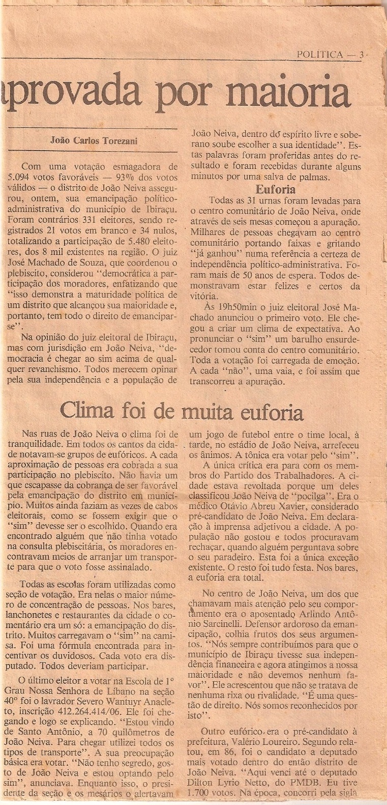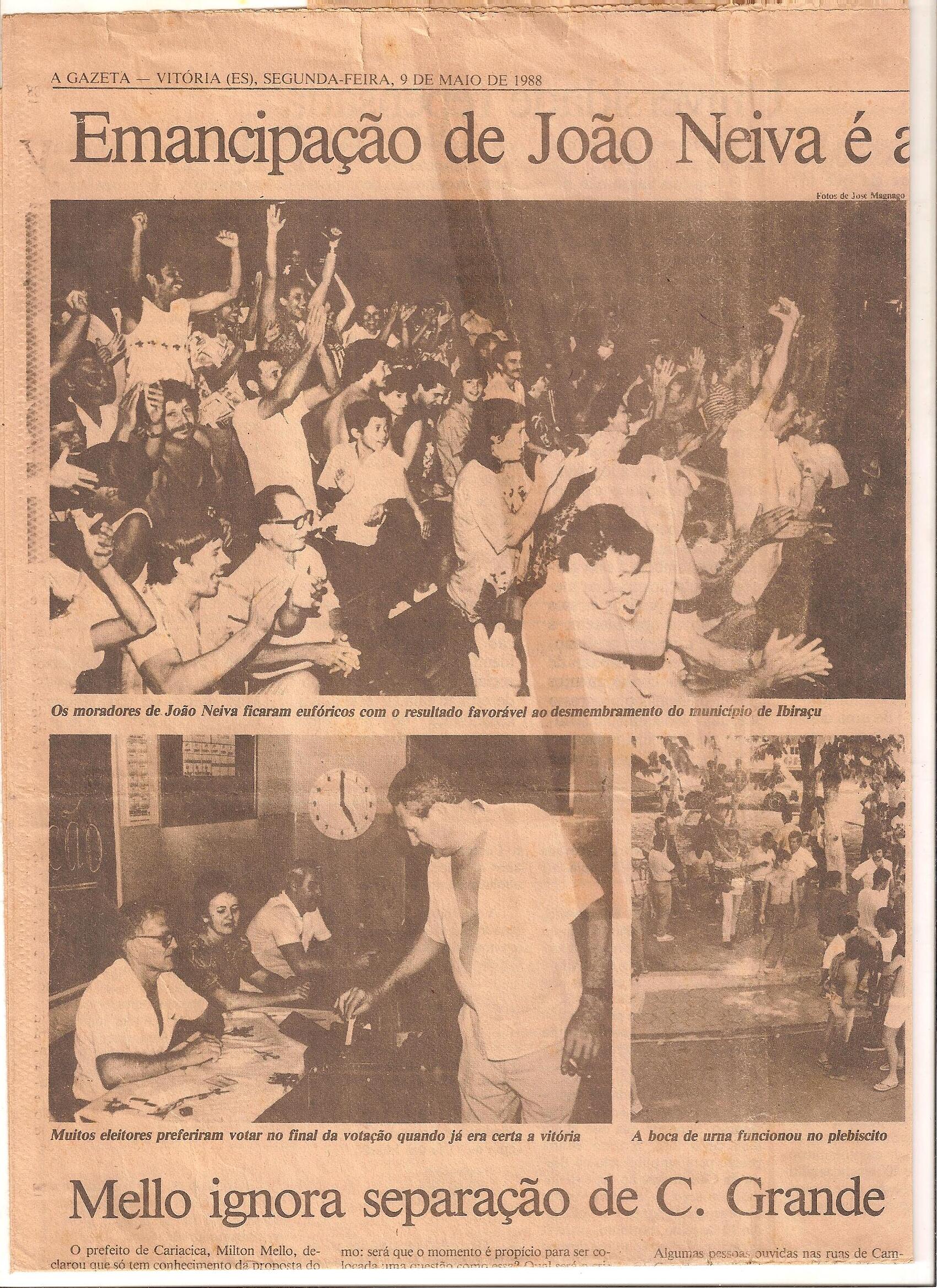 No dia 8 de maio de 1988 a população foi às urnas em um plebiscito histórico: 93% dos votantes disseram “sim” à criação do novo município. A festa tomou conta das ruas de João Neiva. A votação, que ocorreu nas escolas, encerrou-se às 17h tendo a apuração sido realizada no Centro Comunitário. Somente os cidadãos do então distrito votaram. Três dias depois, em 11 de maio, a Lei Estadual n.º 4.076 foi sancionada pelo então vice-governador em exercício Carlos Alberto Cunha, oficializando o nascimento da cidade.