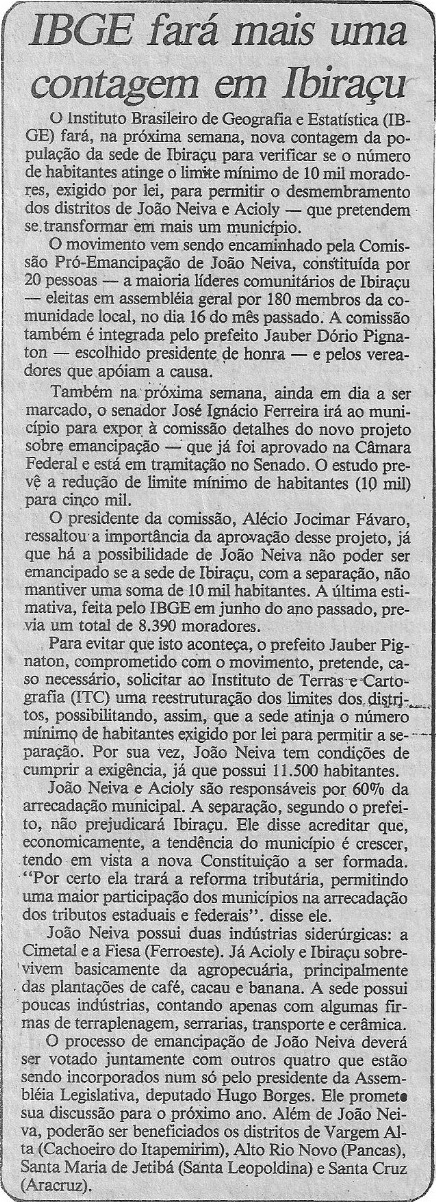 A criação da “Comissão Pró-Emancipação de João Neiva”, composta por 30 membros e contando com representantes de todas as localidades envolvidas, ocorreu já no final do processo, ou seja, para a organização da sociedade local para a etapa do plesbicito. A comissão, formada por lideranças apartidárias, organizou-se em grupos de trabalho para estudar também a viabilidade técnica, territorial e econômica do novo município. “Um dos principais entraves era a exigência legal de que os municípios originários e desmembrados tivessem, cada um, pelo menos 10 mil habitantes. Uma reavaliação feita pelo IBGE em 1987 revelou que o então distrito de João Neiva possuía cerca de 12 mil habitantes, enquanto Ibiraçu contava com 9.700, cujo número era insuficiente”, explica o historiador Adriano Rizzolli Godoy, que pesquisa a história política da região.