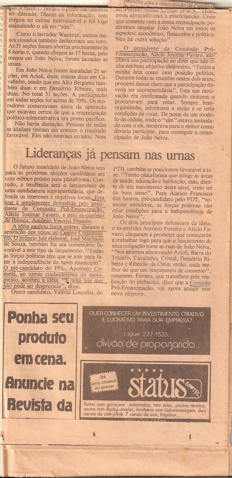 Já na Câmara de Vereadores a mobilização ganhou ainda mais força com o empenho de Apolônio. “A demanda pela emancipação era antiga e legítima. Atuamos com firmeza para reunir os dados, atualizar o censo e dar os trâmites legais ao pedido. Foi um trabalho técnico, político e também de muita sensibilidade social", relembra o advogado, que foi eleito vereador com forte apoio popular e do empresariado, tendo liderado o trâmite para a criação da nova cidade a partir do requerimento que deflagrou a reabertura do processo de emancipação propriamente dito, em 23 de janeiro de 1984.