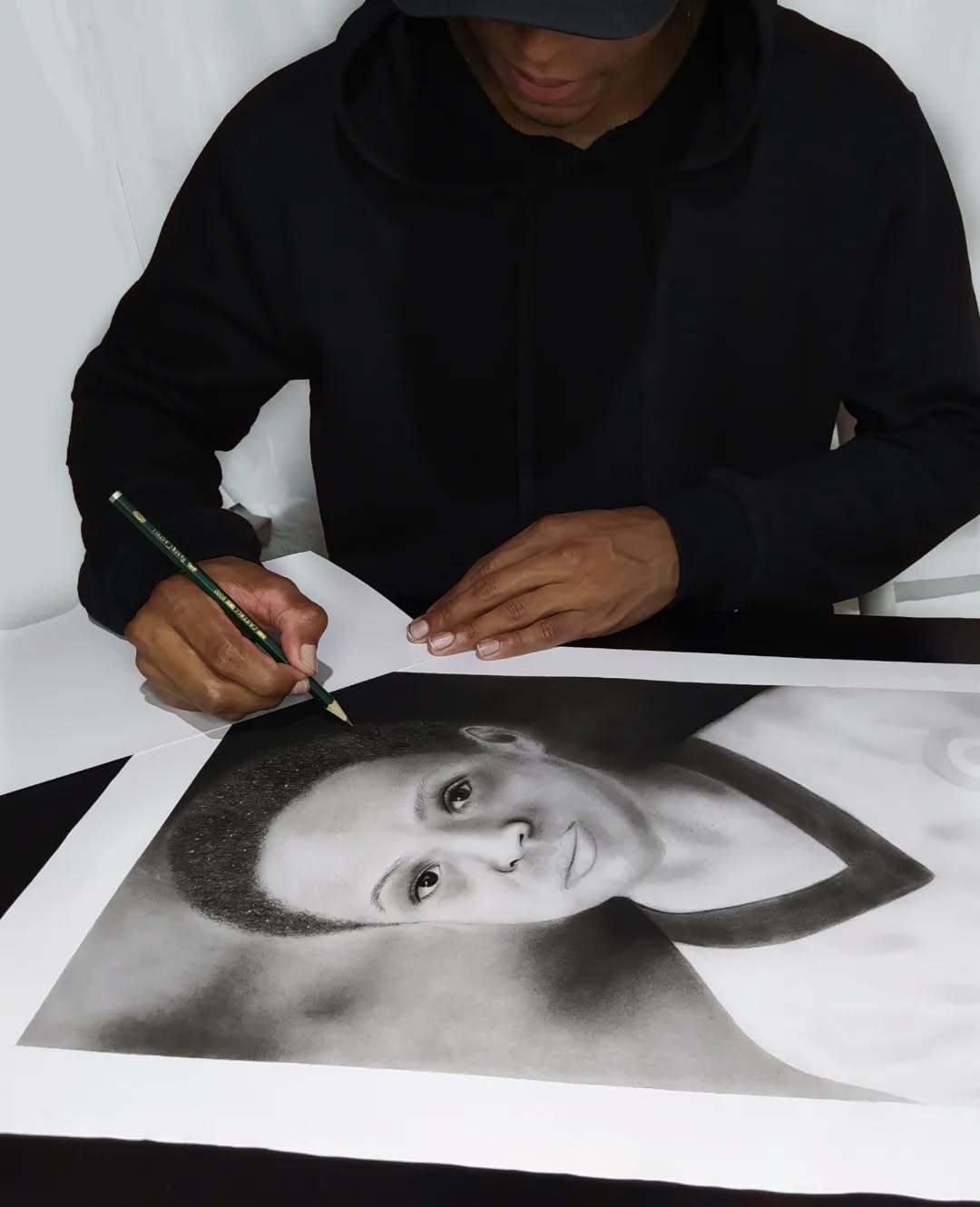 Conhecido por seus retratos hiper-realistas, Lucas transforma o olhar em emoção, o grafite em alma e o carvão do trabalho em poesia visual. Aos 27 anos, ele ainda concilia a rotina de artista com o trabalho em uma empresa de ferro-gusa. O primeiro ambiente que atuou na industria foi no setor de descarga de carvão — e que, ironicamente, acabou se tornando parte de sua arte. “Mesmo cansado do trabalho pesado, algo dentro de mim me impulsiona a criar. Foi no pó do carvão vegetal que encontrei novas formas de expressão. Deus me deu esse dom com um propósito, e eu sigo acreditando que Ele vai me conduzir ao lugar certo”, relata o artista.