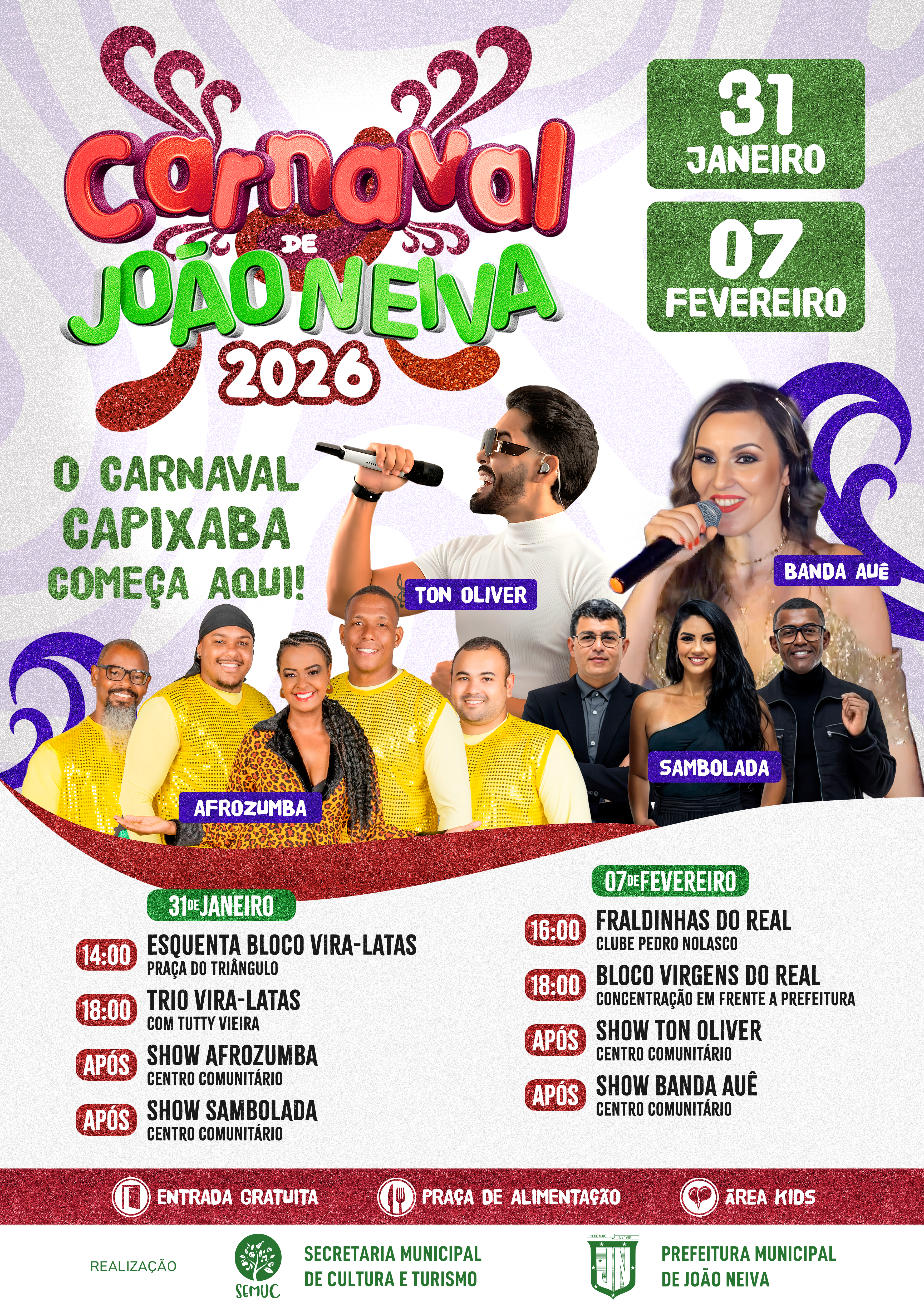 Promovido pela Prefeitura Municipal de João Neiva, por meio da Secretaria Municipal de Cultura e Turismo, o Carnaval contará com programação gratuita, estrutura organizada e atrações para todas as idades, fortalecendo a cultura popular, incentivando o turismo e movimentando a economia local.